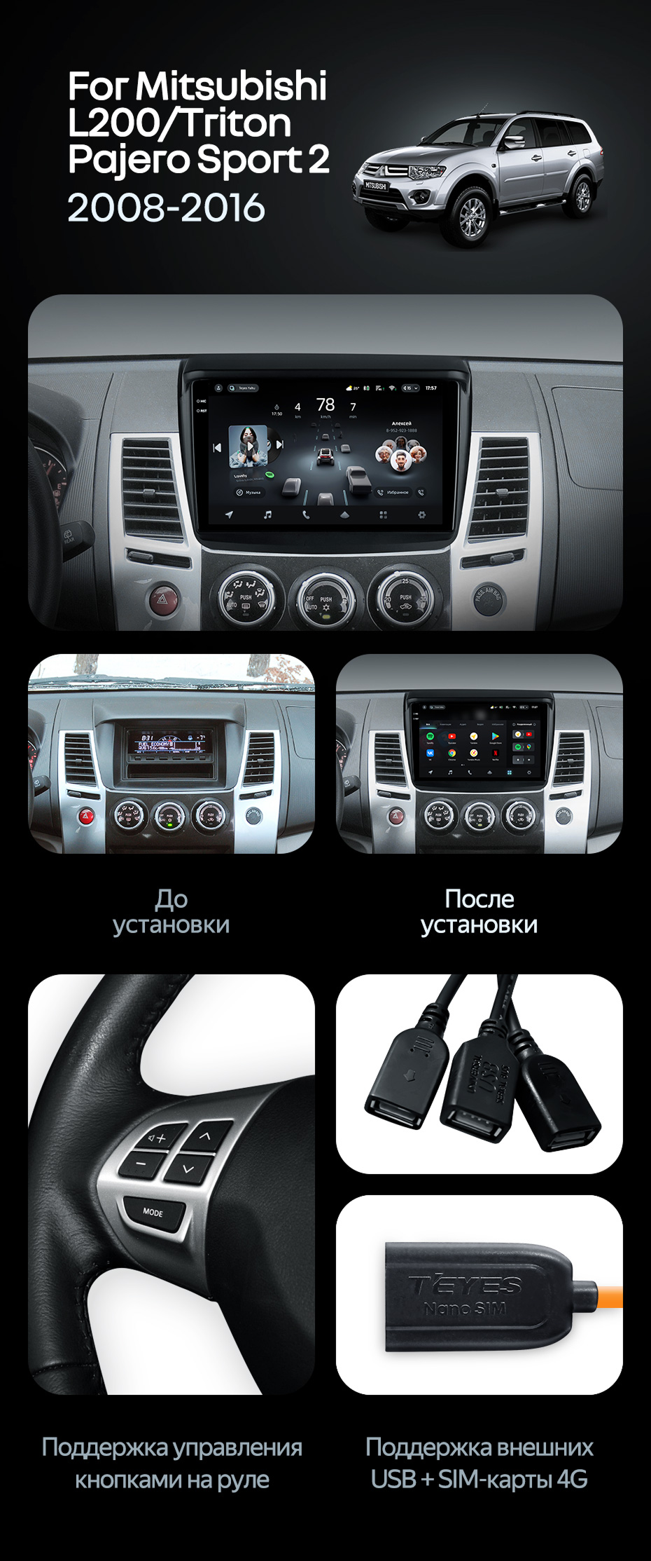 Штатная магнитола Teyes CC4 Pro 8/128 Mitsubishi L200 (2008-2016) - купить всего за 58 440 руб. в интернет-магазине в Кемерове Teyes.com.ru. ✓ Самый лучший выбор мультимедиа ✓ Лучшая замена штатному ГУ ✓ Тел. +7 (800) 775-31-74