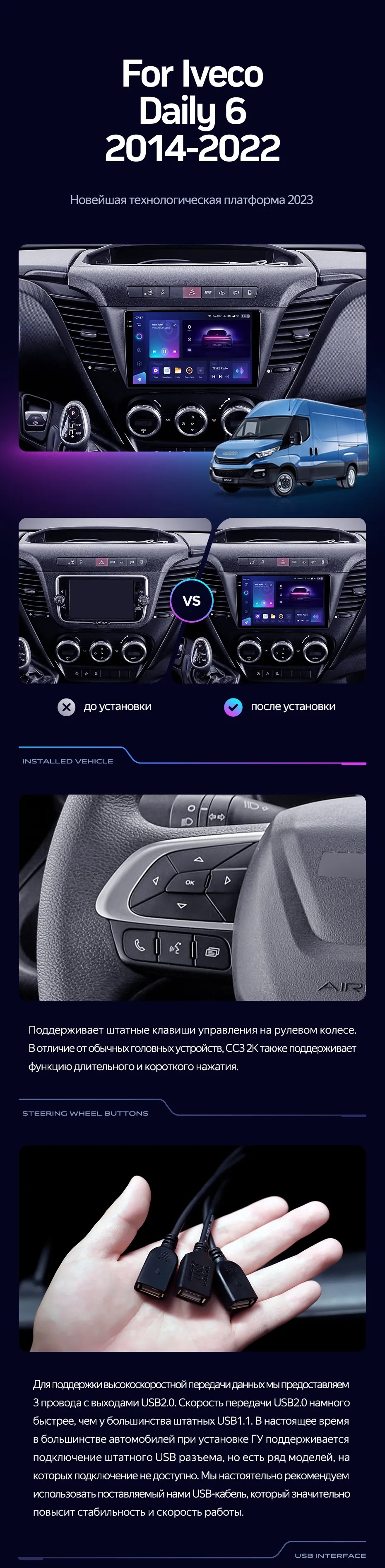 Полный комплект установки магнитолы Teyes с рамкой и проводкой можно выбрать в каталоге штатных магнитол Iveco Daily 6 (2014-2022).