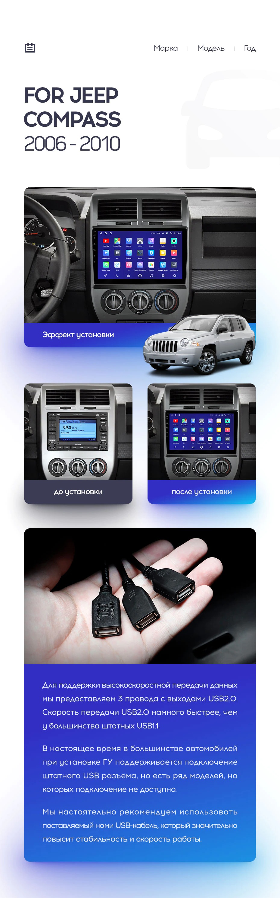 Полный комплект установки магнитолы Teyes с рамкой и проводкой можно выбрать в каталоге штатных магнитол Jeep Compass 1 MK (2006-2010).